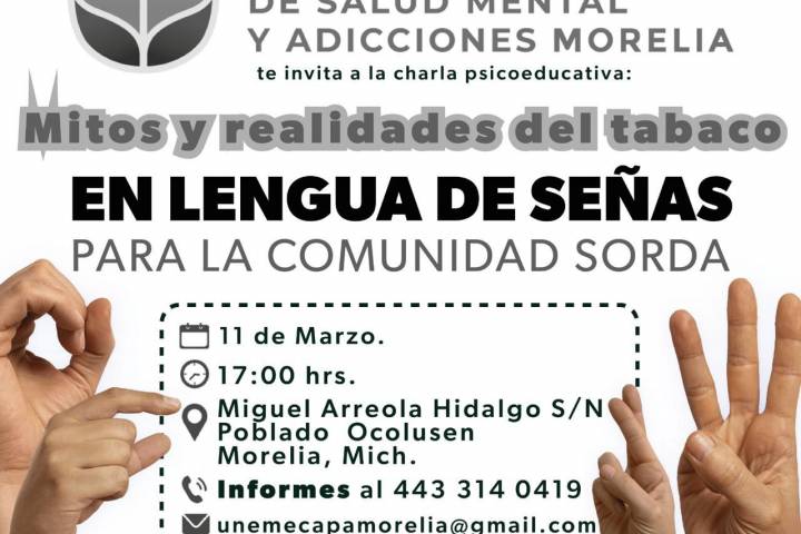 NOTICIAS 08/03/2024SSM dará taller para prevenir el tabaquismo en Lengua de Señas MexicanaPara prevenir y tratar la adicción al tabaco en personas de la comunidad sorda, la Secretaría de Salud de Michoacán (SSM) realizará un taller sobre los mitos y realidades del tabaco en Lengua de Señas Mexicana, el lunes 11 de marzo en el Centro Comunitario de Salud Mental y Adicciones (Cecosama) de Morelia.