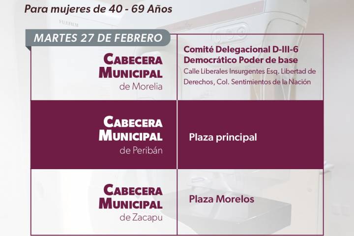NOTICIAS 26/02/2024Realizará SSM mastografías gratuitas en seis municipios Morelia, Zacapu, Peribán, Paracho, Nuevo Parangaricutiro y Huaniqueo, son los municipios donde la Secretaría de Salud de Michoacán (SSM) ofrecerá mastografías gratuitas del 26 de febrero al 1 de marzo, a mujeres de 40 a 69 años.