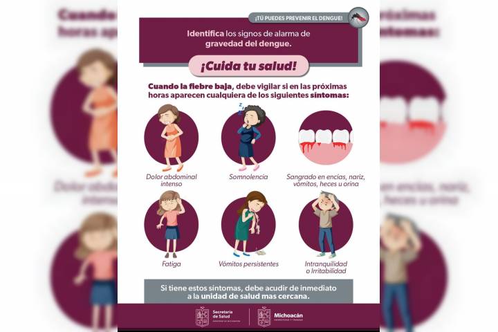 NOTICIAS 17/02/2024Si tienes estos síntomas necesitas atención médica inmediata; podría ser dengueFiebre superior a los 38 grados; dolor intenso de cabeza, huesos, músculos y detrás de los ojos; náuseas; y erupciones rojas en la piel; son los principales síntomas del dengue, enfermedad transmitida por el mosquito Aedes aegypti, que puede mortal si el paciente no recibe atención médica.