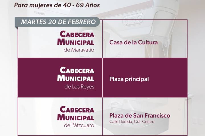 El lunes 19 de febrero los tamizajes se realizarán el centro de salud de Tungareo, municipio de Maravatío, así como en la plaza de Los Reyes y en la plaza Sa... Ver más...