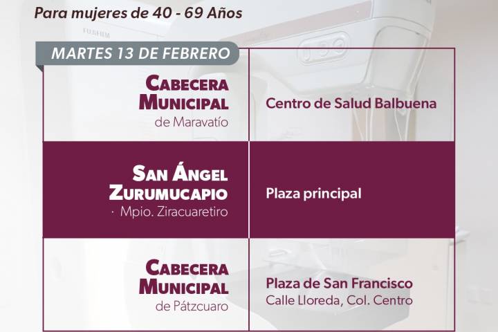 El 12 de febrero las mastografías podrán solicitarse en el centro de salud de Tziritzícuaro, municipio de Maravatío, así como en la presidencia municipal de Paracho y Lagunillas. El ... Ver más...