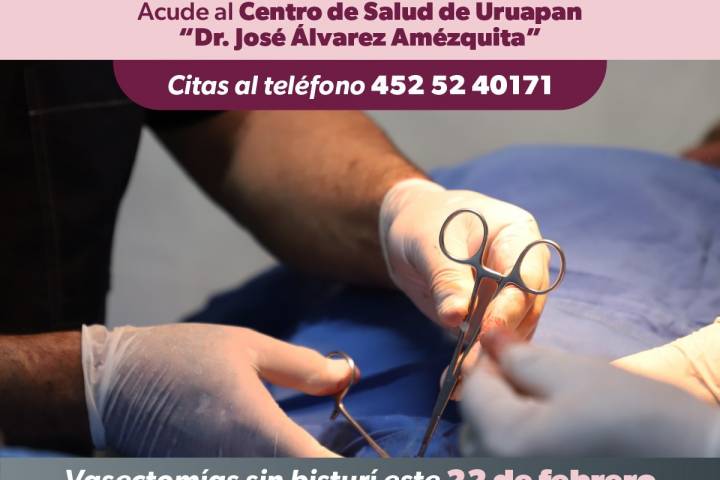 NOTICIAS 03/02/2024Promueve SSM jornada de vasectomía sin bisturí gratuita en Uruapan La Secretaría de Salud de Michoacán (SSM) promueve la jornada de vasectomía sin bisturí gratuita, el próximo 22 de febrero, en el Centro de Salud Urbano de Uruapan José Álvarez Amézquita, ello como parte del programa de planificación familiar permanente que se realiza en esta unidad médica.