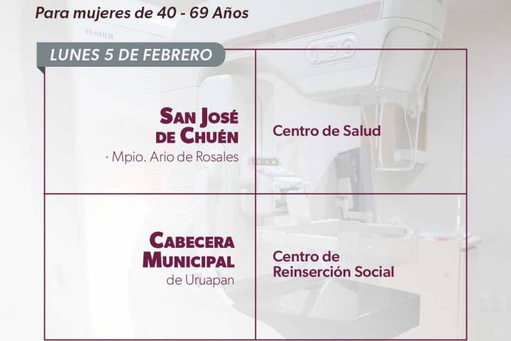 El lunes 5 de febrero el mastógrafo móvil atenderá sin costo a las mujeres de San José Chuén, municipio de Ario y en el Centro de Reinserción Social ... Ver más...