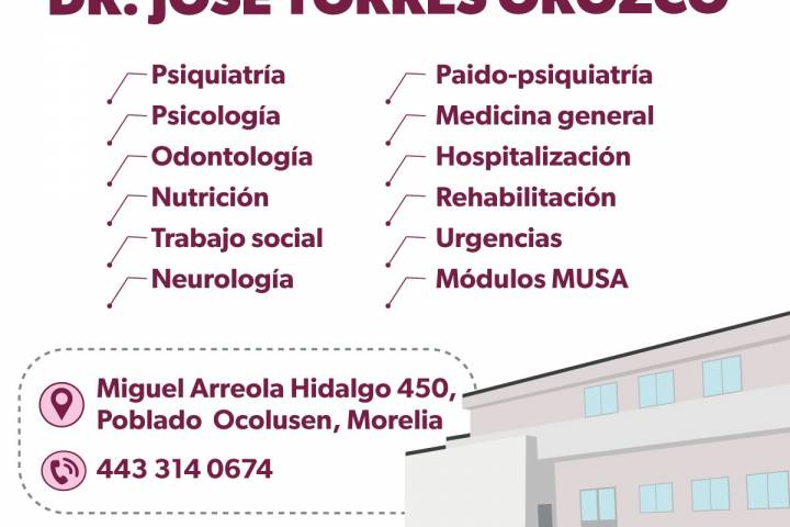 NOTICIAS 20/01/2024Con servicio de paidopsiquiatrÃa, SSM atiende a niños y adolescentes michoacanosEl Hospital Psiquiátrico Dr. José Torres Orozco de la SecretarÃa de Salud de Michoacán a través del servicio de paidopsiquiatrÃa brinda atención integral a niños y adolescentes michoacanos; en 2023, otorgó mil 741 consultas de primera vez y subsecuentes.