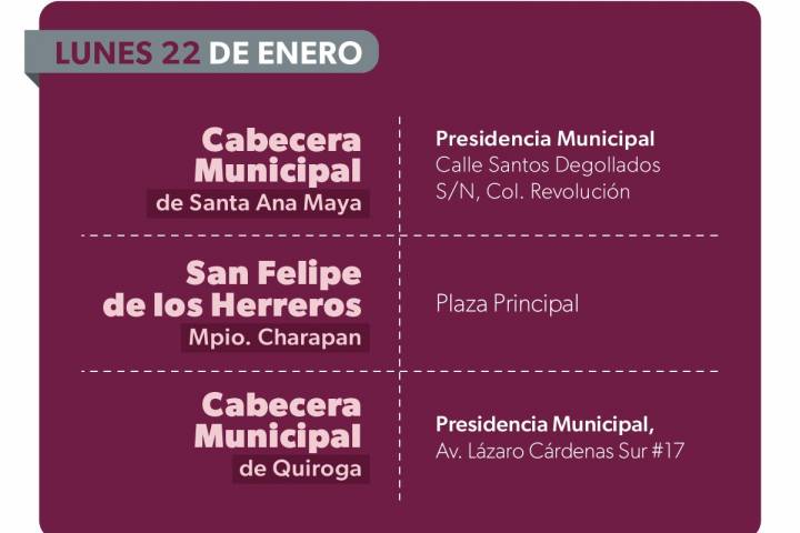 NOTICIAS 21/01/2024Llevará SSM mastografÃas gratuitas al interior del estado La SecretarÃa de Salud de Michoacán (SSM) continúa con su campaña gratuita de mastografÃas por el interior del estado y del 22 al 26 de enero visitará los municipios de Santa Ana Maya, Charapan, Quiroga, Morelia, Salvador Escalante, TarÃmbaro, Tingambato, Tzintzuntzan y Cherán.