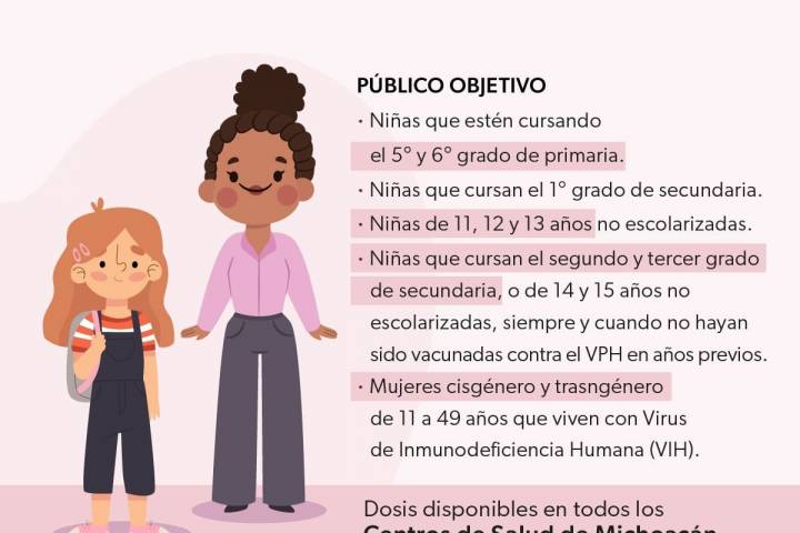 NOTICIAS 22/01/2024Continúa campaña contra virus del papiloma en MichoacánLa SecretarÃa de Salud de Michoacán (SSM) informa a la población que la vacuna contra el Virus del Papiloma Humano (VPH) continúa disponible en los centros de salud de la entidad, para todas las niñas de 11 a 15 años, mujeres cisgénero y transgénero diagnosticadas con el Virus de Inmunodeficiencia Humana (VIH) que aún no han sido inmunizadas.