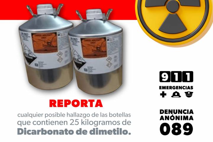 Esto se da seguimiento a una tarjeta informativa enviada por la SecretarÃa de Seguridad y Protección Ciudadana del Gobierno federal, que informa y alerta por el robo de dichas botellas del compuesto quÃmico qu... Ver más...