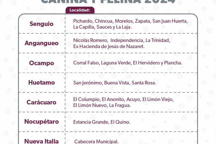 NOTICIAS 16/01/2024SSM anuncia vacunación antirrábica para perros y gatos en 14 municipios Para mantener a la entidad libre de casos de rabia transmitida por mordeduras o ataques de perros y gatos infectados, la SecretarÃa de Salud de Michoacán (SSM) anuncia su campaña de vacunación antirrábica, que abarcará en su primera etapa catorce municipios, del 17 al 19 de enero.