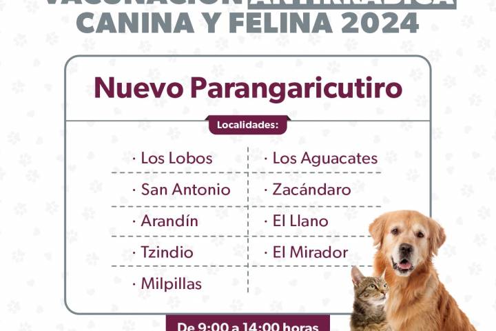 NOTICIAS 18/01/2024Anuncia SSM campaña de vacunación antirrábica en localidades de Nuevo ParangaricutiroLa SecretarÃa de Salud de Michoacán (SSM), a través del Departamento de Vectores, anuncia su campaña de vacunación antirrábica para todos los caninos y felinos en localidades del municipio de Nuevo Parangaricutiro, mejor conocido como San Juan Nuevo.