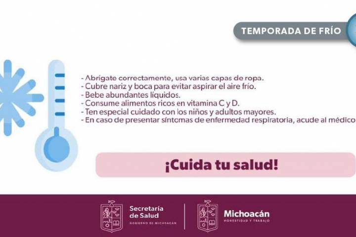 NOTICIAS 03/01/2024SSM mantiene vigilancia por temporada invernal La Secretaría de Salud de Michoacán (SSM) mantiene la vigilancia epidemiológica por la temporada invernal, sobre todo en las regiones donde se registran temperaturas más bajas, debido a que en esta época incrementan las infecciones respiratorias agudas y el riesgo de intoxicación por monóxido de carbono, hipotermia o quemaduras.