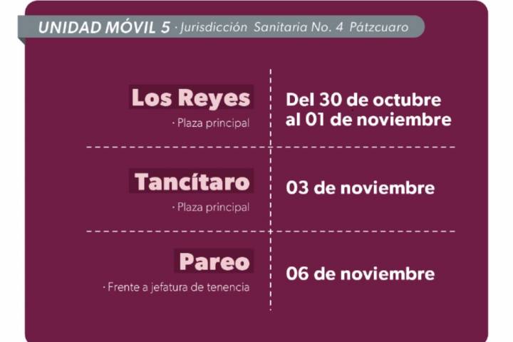 La unidad será instalada del 30 de octubre al 01 de noviembre en la Plaza Principal del municipio de Los Reyes; el día 3 de noviembre en Tancítaro y los días 6 y 7 en sus localidades de Pareo y U... Ver más...
