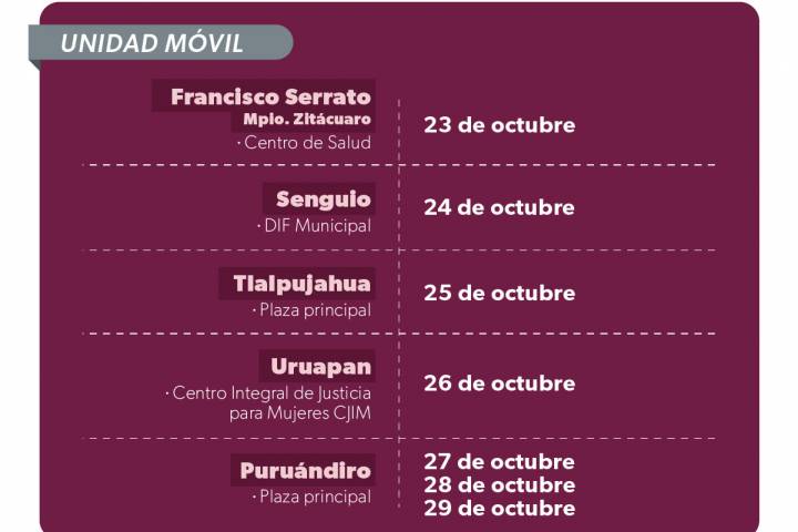 Este lunes 23 estarán en Tarímbaro y Zitácuaro, el martes 24 de octubre en Senguio, los días 23 y 24 en Cotija, y del 23 al 26 de octubre en comunidades de Múgica y Peribán.