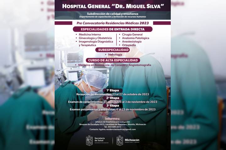 NOTICIAS 23/10/2023SSM convoca a médicos para residencias en hospitales de MoreliaLa Secretaría de Salud de Michoacán (SSM) abrió la recepción de documentos para ingresar a una de las residencias médicas de especialidad y subespecialidad de los hospitales General Dr. Miguel Silva, Infantil Eva Sámano de López Mateos, y de la Mujer, en Morelia.