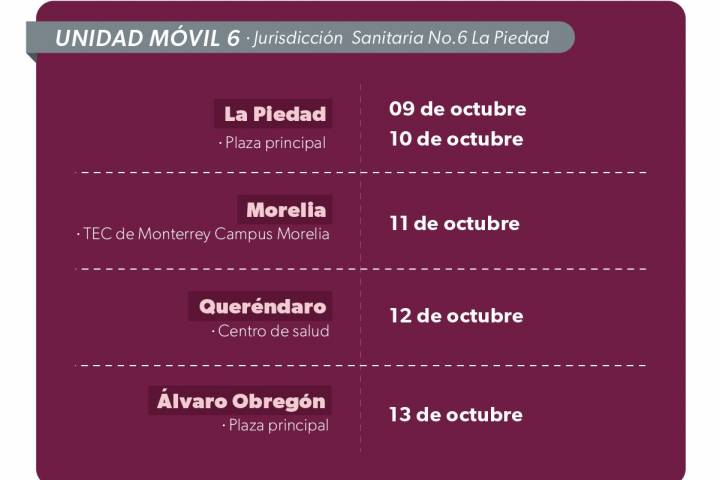 NOTICIAS 06/10/2023SSM realizará mastografías gratuitas en 9 municipios de MichoacánDel 9 al 13 de octubre, la Secretaría de Salud de Michoacán (SSM) llevará mastografías gratuitas a mujeres de 40 a 69 años de edad en nueve municipios de la entidad, para detectar y atender de manera oportuna nuevos casos de cáncer de mama.