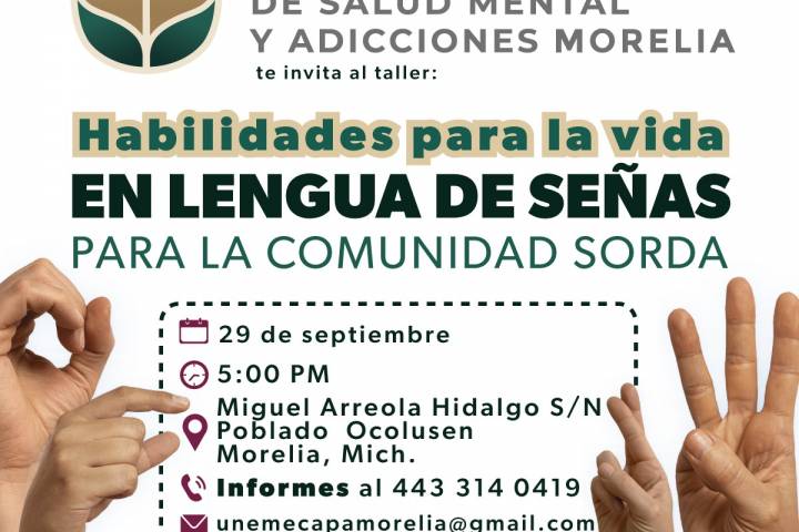 NOTICIAS 27/09/2023Realizará SSM taller para la prevención del suicidio en Lengua de Señas MexicanaCon el objetivo de prevenir la ansiedad, depresión, adicciones y tendencias suicidas en personas sordas, la Secretaría de Salud de Michoacán (SSM), a través de la Dirección de Salud Mental, realizará el próximo viernes 29 de septiembre el taller Habilidades para la Vida en Lengua de Señas Mexicana.
