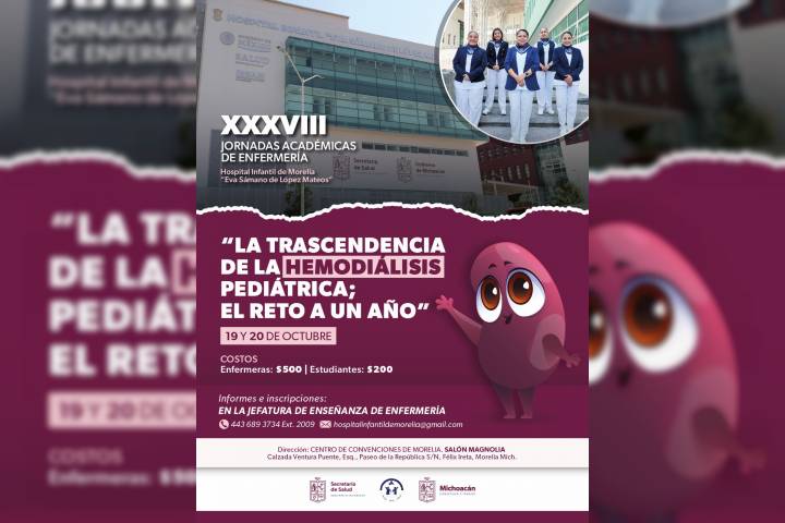 NOTICIAS 29/09/2023Capacitará SSM a estudiantes y enfermeras en salud renal infantilEl Hospital Infantil de Morelia Eva Sámano de López Mateos, de la Secretaría de Salud de Michoacán (SSM), invita a profesionales y estudiantes de enfermería a participar en las XXXVIII Jornadas de Enfermería, que se realizarán los días 19 y 20 de octubre, en el Centro de Convenciones y Exposiciones de Morelia (Ceconexpo).