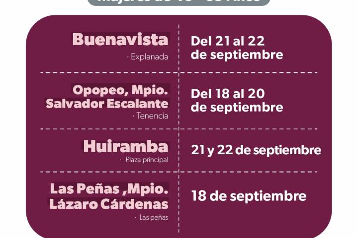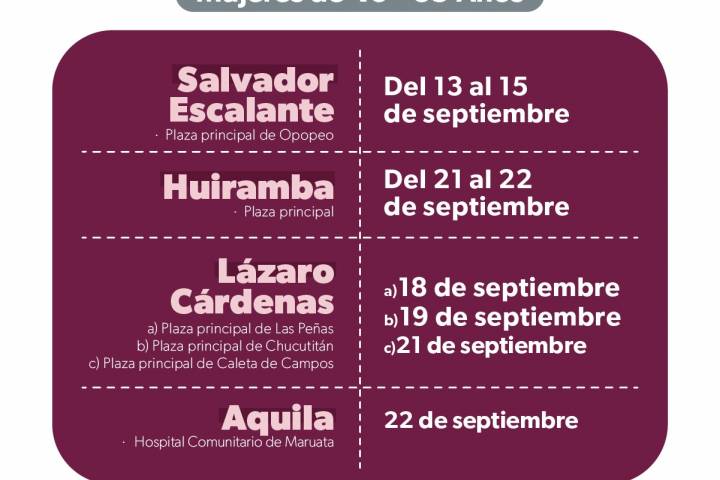 NOTICIAS 14/09/2023Realizará SSM mastografías gratuitas en 7 municipios de MichoacánLa Secretaría de Salud de Michoacán (SSM) redobla esfuerzos para detectar y atender de manera oportuna el cáncer de mama en mujeres de 40 a 69 años de edad, es por ello que del 18 al 22 de septiembre llevará unidades móviles de mastografía a localidades y cabeceras de los municipios de Sahuayo, Venustiano Carranza, Buenavista, Tepalcatepec, Salvador Escalante, Aquila, y Lázaro Cárdenas.