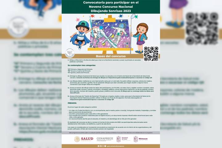 NOTICIAS 17/09/2023Anuncia SSM, cierre de convocatoria del Concurso Nacional Dibujando Sonrisas 2023La Secretaría de Salud de Michoacán (SSM), recuerda a niñas y niños de la entidad, que el día de mañana 18 de septiembre se cierra la convocatoria para participar en el Noveno Concurso Nacional Dibujando Sonrisas 2023, realizado por la Secretaría de Salud Federal (SSA), en dónde participan las todas entidades federativas.