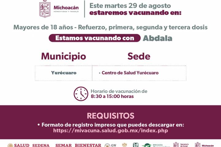 Se estará aplicando el biológico Abdala en un horario 8:30 a 15:00 horas, quienes deberán presentarse con su formato de registro impreso, el cual podrán descargar en la página https://mivacu... Ver más...
