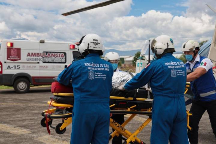 NOTICIAS 12/08/2023Con ambulancia aérea, SSM da atención oportuna a urgencias médicas Con la ambulancia aérea del Gobierno de Michoacán, 80 pacientes graves han recibido atención oportuna en lo que va del año. Debido a la inmediatez de los traslados, que no hubiera sido posible por carretera, los pacientes se han recuperado de delicadas emergencias obstétricas, quemaduras, y traumatismos por accidentes de tránsito.
