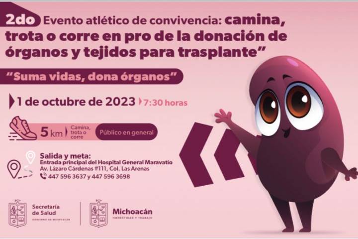 NOTICIAS 13/08/2023Realizará SSM carrera para promover la donación de órganosLa Secretaría de Salud de Michoacán (SSM), llevará a cabo la segunda edición del evento Atlético de Convivencia, camina, trota a corre en pro de la Donación de Órganos y Tejidos para Trasplantes, en el municipio de Maravatío.
