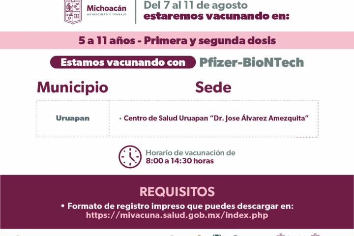 NOTICIAS 07/08/2023SSM anuncia vacunación COVID en 3 municipios para menores de 5 a 11 añosLa estrategia nacional de vacunación contra el COVID-19 avanza en la entidad, y a partir de este lunes 7 y hasta el próximo 11 de agosto la Secretaría de Salud de Michoacán (SSM) vacunará en tres municipios a las niñas y niños de cinco a 11 años cumplidos.