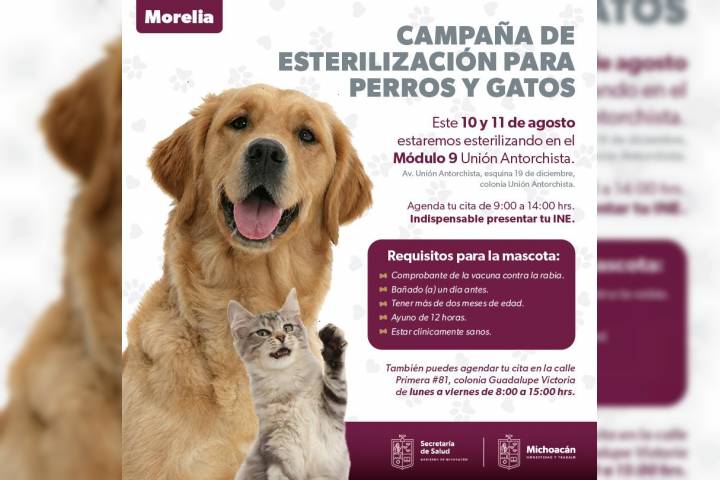 NOTICIAS 09/08/2023Anuncia SSM campaña de esterilización canina y felina en MoreliaLa Secretaría de Salud de Michoacán (SSM) llevará a cabo los días jueves 10 y viernes 11 de agosto su campaña de esterilización canina y felina en la colonia Unión Antorchista de Morelia, con el objetivo de controlar la población de perros y gatos en situación de calle.