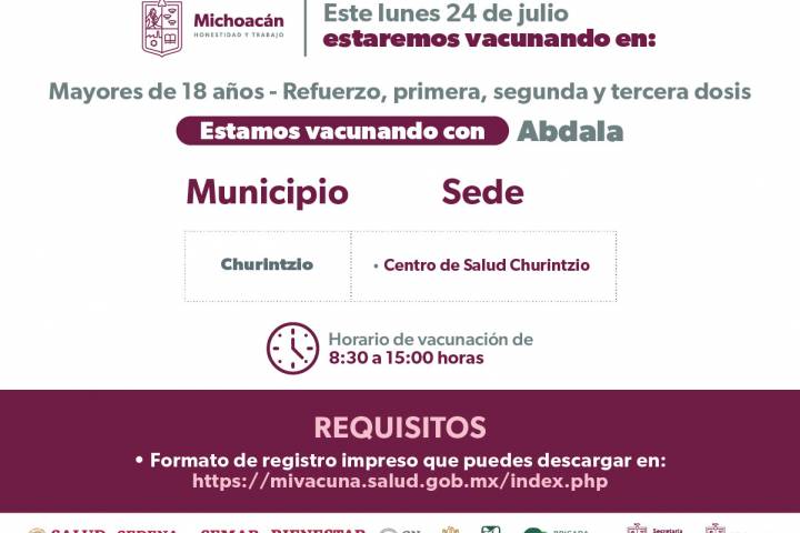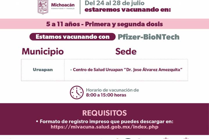 Zitácuaro, Lázaro Cárdenas y Uruapan serán las tres sedes de inmunización de primeras y segundas dosis del biológico Pfizer BioNTech para este grupo de la población, con atención de 8:00 a 15:00 horas.