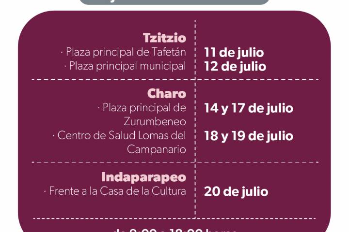 En Tzitzio, las usuarias serán atendidas el martes 11 de julio en la plaza de la tenencia de Tafetán, de 09:00 a 18:00 horas; mientras que el miércoles 12 será en la plaza principal, ubicada frente a ... Ver más...