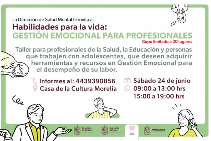 NOTICIAS 21/06/2023Invita SSM a curso de gestión emocional para profesionalesLa SecretarÃa de Salud de Michoacán (SSM) invita a los profesionales de la Salud, Educación y personas que trabajen con adolescentes, al taller Habilidades para la vida: Gestión Emocional para Profesionales.