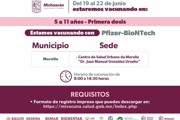 NOTICIAS 17/06/2023Anuncian vacunación COVID-19 para menores de 5 a 11 años en 5 municipios de MichoacánLa Secretaría de Salud de Michoacán (SSM) informa que del 19 al 23 de junio se aplicarán primeras dosis de la vacuna contra el COVID-19 a menores de 5 a 11 años, en los municipios de Morelia, Zamora, Jacona, Apatzingán, Lázaro Cárdenas y Uruapan.