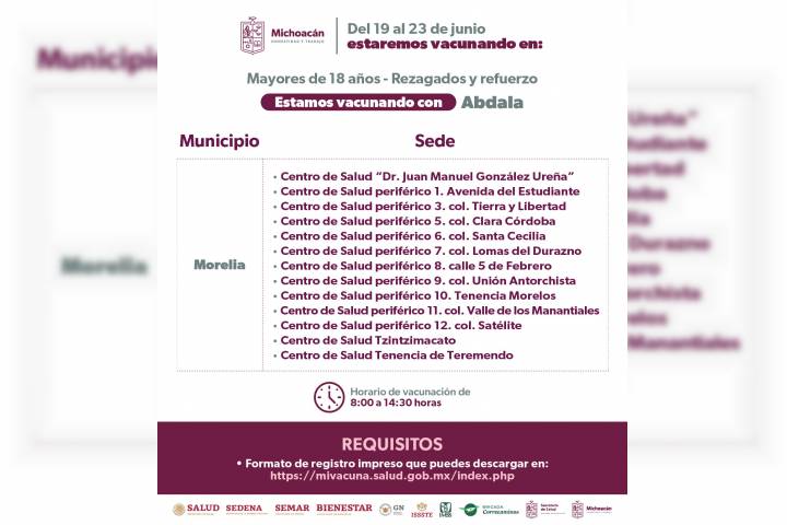 NOTICIAS 19/06/2023Continúa la vacunación contra el COVID-19 en centros de salud de MichoacánContinúa la vacunación contra el COVID-19 con el biológico Abdala en los centros de salud de Michoacán para las personas mayores de 18 años. Pueden aplicarse el refuerzo o por primera vez.