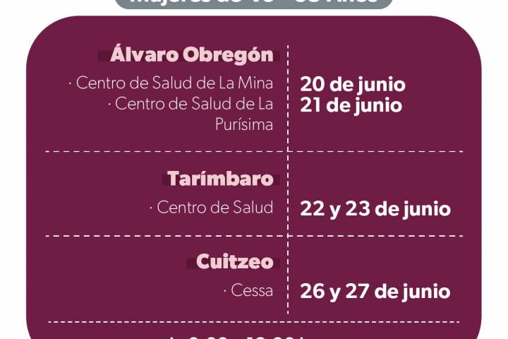 El cáncer de mamá es una enfermedad curable en etapas tempranas, es por ello que la Secretaría de Salud de Michoacán (SSM) llevará mastografías gratuitas a mujeres de 40 a 69 años de edad, en los municipios de Álvaro Obregón, Tarímbaro y Cuitzeo, del 20 al 27 de junio.