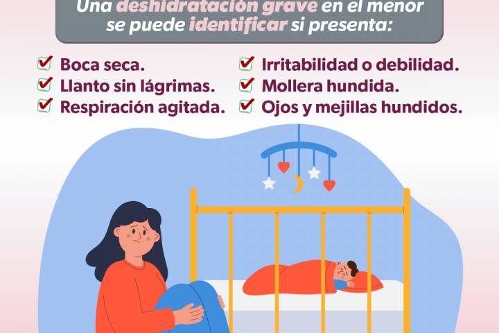 Una deshidratación grave en el menor se puede identificar si presenta boca seca, llanto sin lágrimas, respiración agitada, irritabilidad, mollera hundida mollera, ojos y mejillas hundidos, o debilidad.