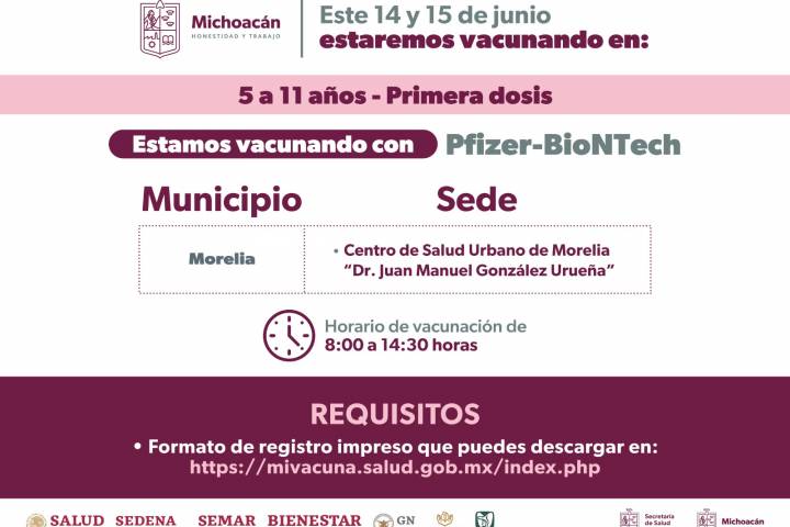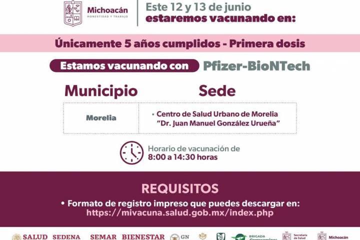 La jornada de inmunización iniciará este 14 y 15 de junio en los municipios de Morelia, Uruapan y Zitácuaro, para continuar la próxima semana en Zamora, Apatzingán, Pátzcuaro, Lázaro Cárdenas y La Piedad.