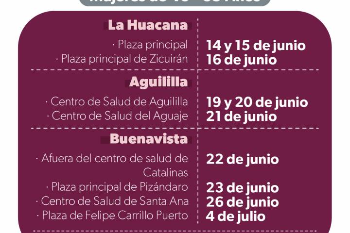 NOTICIAS 13/06/2023Anuncia SSM mastografías gratuitas en 3 municipios de Tierra CalienteLa Secretaría de Salud de Michoacán (SSM) invita a mujeres de entre 40 y 69 años de edad de los municipios de La Huacana, Aguililla y Buenavista, a realizarse una mastografía gratuita en las jornadas que la institución implementará del 14 de junio al 4 de julio.