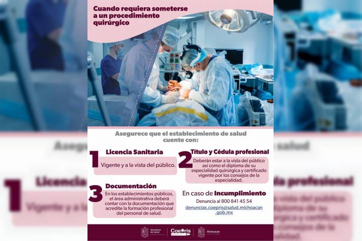 NOTICIAS 09/06/2023SSM emite estas recomendaciones antes de someterse a una cirugía Con la finalidad de proteger la salud de la población, la Secretaría de Salud de Michoacán (SSM), a través de la Comisión Estatal para la Protección contra Riesgos Sanitarios (Coepris), emite una serie de recomendaciones para la población que requiera someterse a un procedimiento quirúrgico, ya sea por cirugía general, de especialidad plástica, reconstructiva, u otra.