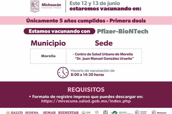NOTICIAS 09/06/2023Anuncia SSM vacunación COVID-19 para menores de 5 añosPara continuar con el Plan Nacional de Vacunación, la Secretaría de Salud de Michoacán (SSM), informa a la población que del 12 al 14 de junio, niñas y niños con cinco años cumplidos serán vacunados contra el COVID-19 en primeras dosis, en los municipios de Morelia, Zitácuaro y Uruapan.