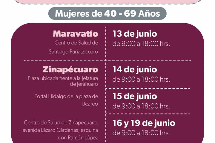 NOTICIAS 12/06/2023Anuncia SSM mastografías gratuitas en Maravatío y Zinapécuaro Del 13 al 19 de junio, la Secretaría de Salud de Michoacán (SSM) llevará a cabo jornadas de mastografías gratuitas en localidades de los municipios de Maravatío y Zinapécuaro, con el objetivo de proporcionar diagnósticos oportunos que permitan salvar la vida de mujeres con cáncer de mama.