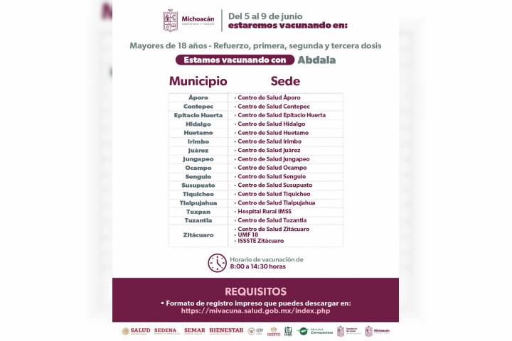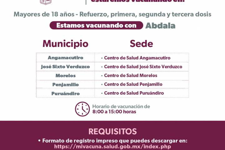 NOTICIAS 03/06/2023Continúa vacunación COVID-19 en 85 municipios de MichoacánDel 5 al 11 de junio el sector salud seguirá vacunando con el biológico Abdala a la población mayor de 18 años que requiere refuerzo, primera, segunda o tercera dosis.