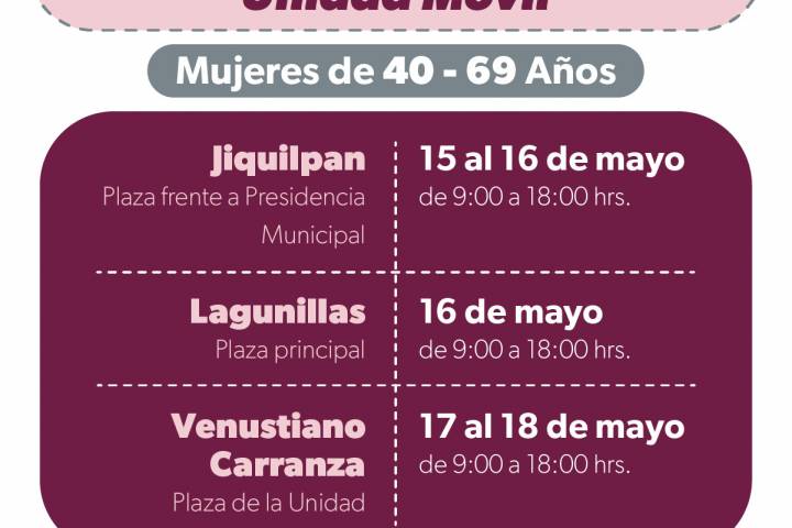 La primera jornada será en Jiquilpan, donde los estudios se llevarán a cabo en la plaza ubicada frente a la presidencia municipal de 09:00 a 18:00 horas. El martes 16 el mastógrafo móvil llegará a la plaza principal de Lagunillas, con ... Ver más...