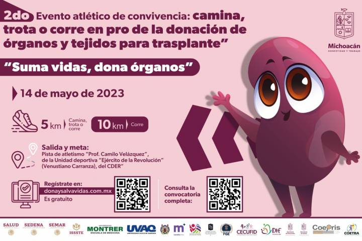 NOTICIAS 08/05/2023Continúa abierta la convocatoria para participar en la carrera Suma vidas, dona órganos La SecretarÃa de Salud de Michoacán (SSM) informa a la población que continúan abiertas las inscripciones para participar en la segunda edición del evento atlético de convivencia Suma vidas, dona órganos, que se realizará el próximo domingo 14 de mayo en el Centro Deportivo Ejército de la Revolución, mejor conocido como Venustiano Carranza.