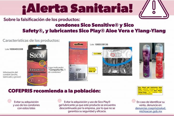 NOTICIAS 10/05/2023Alerta SSM sobre condones y lubricantes falsificadosLa Comisión Federal para la Protección contra Riesgos Sanitarios (Cofepris), a través de la SecretarÃa de Salud de Michoacán (SSM), alerta a la población sobre la falsificación de condones Sico Sensitive y Sico Safety, y de lubricantes Sico Play aloe vera e ylang-ylang, de la empresa RB HEALTH MEXICO S.A. de C.V., distribuidor de los mismos.