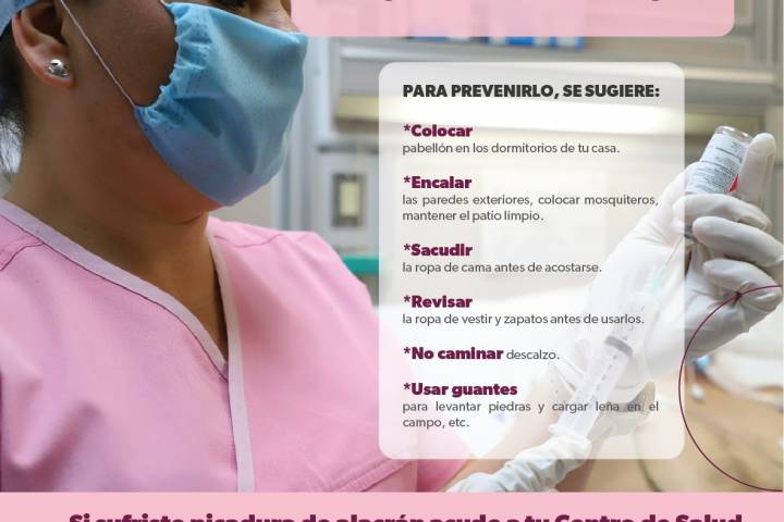 La autoridad sanitaria exhorta a la población que sea picada por un alacrán, aplicar compresas de agua fría o hielo en la zona, para calmar el dolor, evitar retirar el veneno con la boca o aplicar soluciones sobre ... Ver más...
