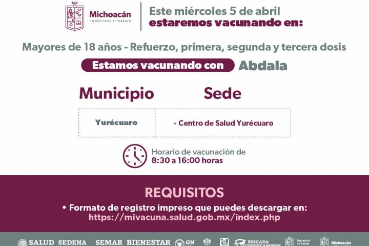NOTICIAS 02/04/2023Anuncia SSM vacunación contra COVID-19 en 88 municipios de MichoacánDel 3 al 6 de abril se realizarán intensas jornadas de vacunación contra el COVID-19 en 88 municipios de la entidad, para atender a la población mayor de 18 años y aplicar primeras, segundas y terceras dosis del biológico Abdala.