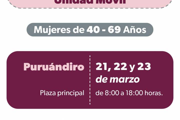 Los estudios se llevarán a cabo en una unidad móvil que se instalará en la plaza principal de Puruándiro desde las 08:00 hasta las 18:00 horas, las citas pueden agendarse en las instala... Ver más...