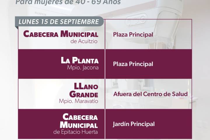 NOTICIAS 14/09/2025Llegan mastógrafos móviles a 8 municipios: SSMLa Secretaría de Salud de Michoacán (SSM) invita a mujeres de 40 a 69 años de Acuitzio, Jacona, Maravatío, Epitacio Huerta, Madero, Tangamandapio, Carácuaro y Nocupétaro a estar atentas a la llegada de las unidades móviles de mastografía, para que se realicen el estudio de mama gratuito.