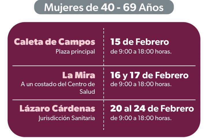 NOTICIAS 16/02/2023Llevará SSM mastografías gratuitas a Lázaro Cárdenas Del 15 al 24 de febrero, la Secretaría de Salud de Michoacán (SSM) llevará mastografías gratuitas a mujeres de entre 40 a 69 años del municipio de Lázaro Cárdenas.