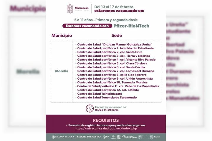 NOTICIAS 17/02/2023Continúa vacunación contra COVID-19 en centros de salud de MoreliaLa Secretaría de Salud de Michoacán (SSM) recuerda a la población que los 15 centros de salud que hay Morelia continúan con la vacunación contra el COVID-19 de 8:00 a 14:30 horas.