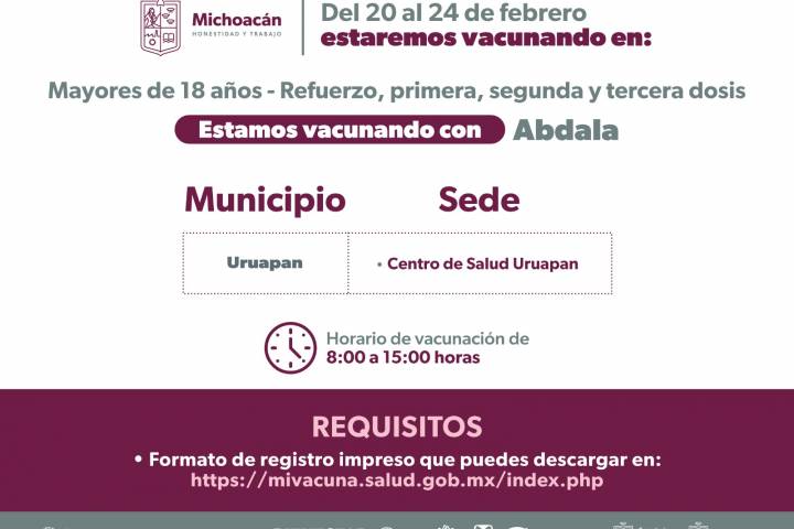 NOTICIAS 20/02/2023Continúa en Uruapan vacunación contra COVID-19: SSMLa Secretaría de Salud de Michoacán (SSM) continúa con la vacunación contra el COVID-19 en el municipio de Uruapan, en el centro de salud ubicado en la calle Manuel Pérez Coronado, en la colonia la Magdalena.